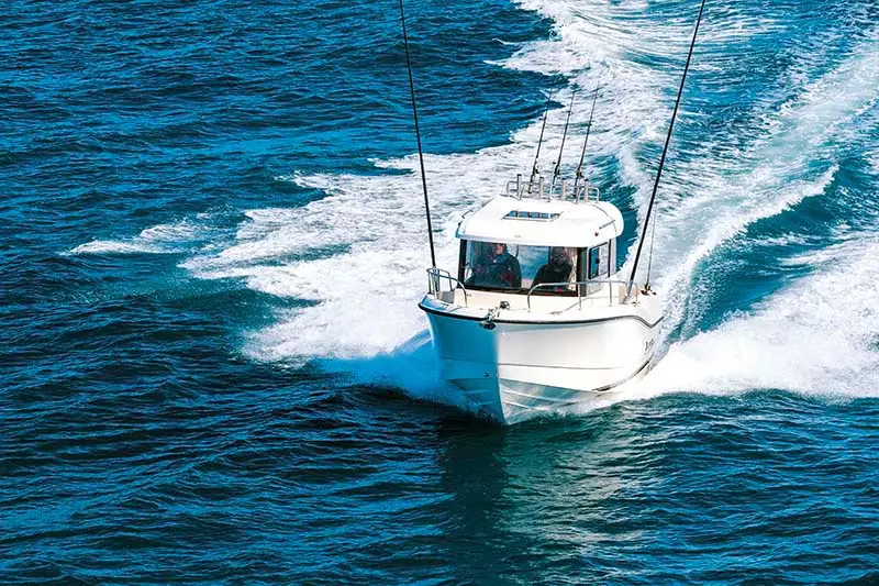 We reviewed a hardtop Jeanneau Merry Fisher Marlin 695 that was powered by a Yamaha F150 outboard motor. It handled well, with the hydraulic steering requiring minimum effort to turn while offering good acceleration. Skipping across chop we reached a cruising speed of 17.5kts with fuel consumption a moderate 28.3lt/h.