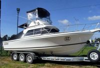 Here is an Outstanding opportunity to purchase a trully magnificent Vessel! Our Managing Directors own Boat with only 100Hours! That's Correct,ONLY 100 LOW HOURS OF USE. This 26 Flybridge is presented in First Class Condition and will offer to any Prospective Purchaser an Outstanding Value for Money Package. Don't Miss this One, Phone or Email now to book an inspection! Features include.full cabin bulkhead and door, seperate shower and toilet cubicle, hot and cold water system, full flybridge bimini & all round clears, tonneau cover,cocpit sun awning, windscreen privacy curtains,dinette table.stereo system, gps/ depth sounder, sink and stove recess, carpet throughout.electric anchor winch