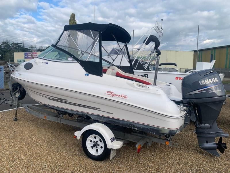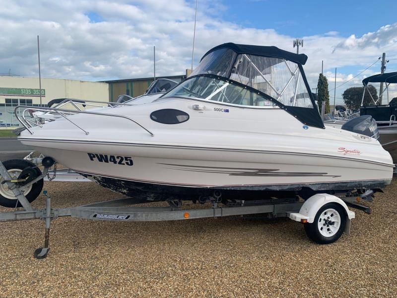 HAINES SIGNATURE 500C CUDDY CABIN FOR SALE. THIS SIGNATURE 500C CUDDY IS VERY TIDY AND IS POWERED BY THE 90 HP YAMAHA FOUR STROKE OUTBOARD WITH ONLY 172 HOURS ON IT. FEATURES INCLUDE BIMINI WITH FRONT & SIDE CLEARS, DELUXE REAR LOUNGE, TRAVEL COVER, SKI POLE, BOARDING LADDER, GME VHF RADIO, AM/FM CD PLAYER, LOWRANCE 5" GPS COMBO, COMPASS, COAMING LIGHTS & FULL CARPETS. COMES WITH SAFETY GEAR & 12 MONTHS OUTBOARD WARRANTY. READY TO GO. WINTER CLEARANCE ONLY $29,990.00. MERCURY FINANCE AVAILABLE T.A.P. CALL TERRY AT OUR *** DEALERSHIP FOR MORE INFO ON ***.