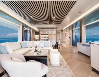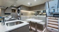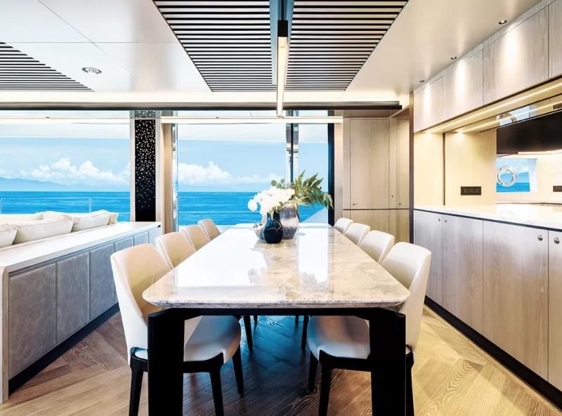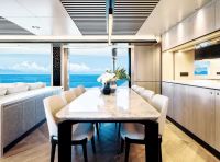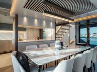 As you step onboard, the large saloon windows emphasise the great volume of the yacht’s welcoming and contemporary interiors. The ample entertaining areas on multiple levels and luxurious cabins complement the impressive design. Boasting modern yet functional layout, with premium materials and finishes throughout. The main salon features a spacious open-plan layout with a lounge area, formal dining, and a fully equipped chefs galley. Large sliding glass doors lead to the aft deck, offering seamless indoor-outdoor living. AURA can accommodate up to 10 guests in five en-suite staterooms with four well-appointed guest cabins below deck and an expansive owners enclave, ideally located with stair-free access forward on main deck. The two crew cabins, sleeping four, are thoughtfully designed and are situated aft to ensure maximum privacy and comfort for all on board.