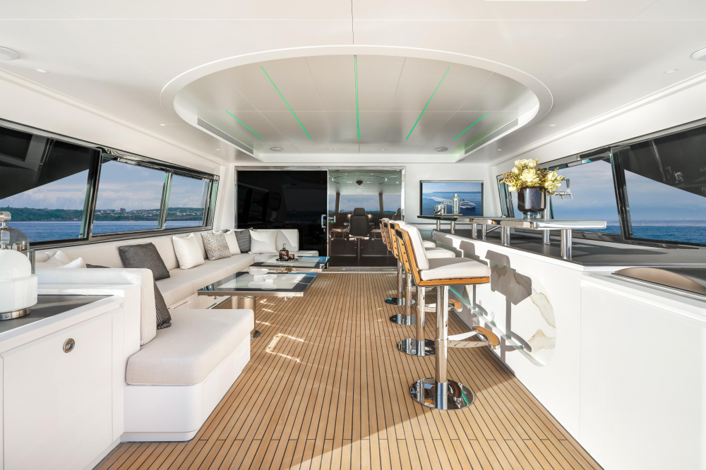 A standout feature aboard this FD100 is the model’s first Open Galley layout. Designed as a social focal point, the galley merges practicality with artistic expression, underscored by a geometric ceiling design with integrated LED lighting. By favoring indirect ambient illumination over direct spotlights, the space maintains a soft, welcoming glow that complements the expansive floor-to-ceiling windows.
