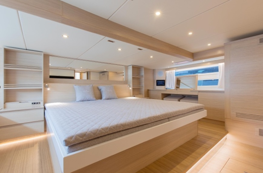 The yacht’s layout is designed for both relaxation and functionality. An open-plan saloon flows effortlessly to the aft deck and sun lounge, while glass doors and a retractable roof adapt to any weather. Below, four ensuite cabins — including a full-beam master suite with his-and-hers bathrooms — accommodate up to eight guests. A dedicated crew cabin ensures privacy and seamless service.