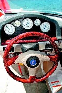 I was impressed by the fact that the co-pilot's back-to-back seat slides, as this style of seat often doesn't have an adjustor. Ahead of the co-pilot was the Clarion marine stereo, with a remote across at the helm and a token in-dash icebox. The lid for the icebox was terribly flimsy and unbecoming of this boat's overall finish and quality. On the skipper's side, the helm bolster seat does a great job of keeping you contained. A neat new feature is a small lock-up compartment for stowing personals at the helm. The mock burlwood dash was a low-glare number with groovy new engine gauges, a depthsounder and trim gauge for the Alpha One leg.