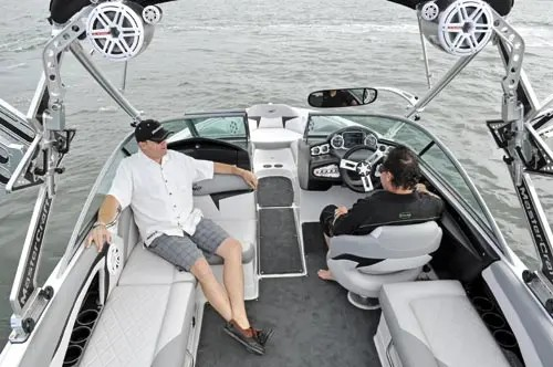 On the side is the slick control box/armrest, incorporating a tab setting and ballast switch panel, stereo remote, USB docking port and stereo speakers, and all with the protection of a full wraparound, lightly-tinted screen. Above the screen is a wide-angle rearview mirror, so you can keep an eye on skiers. It's a great feature but this one seemed to vibrate and lose its setting during the test. On the passenger side is a large glovebox, with the Clarion stereo system inside, and a backrest in which to get comfy while watching riders.