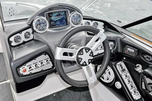 The captain's office was definitely the most "bling" part of this boat, and it got me going. It comprised an adjustable swivel seat and a dash setup that made me feel as if I was in some sort of souped-up Subaru rally car. I liked the adjustable sports-steering wheel, the dual-switch panels on either side, and heater switches ready to go.