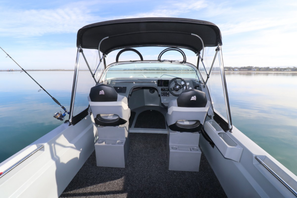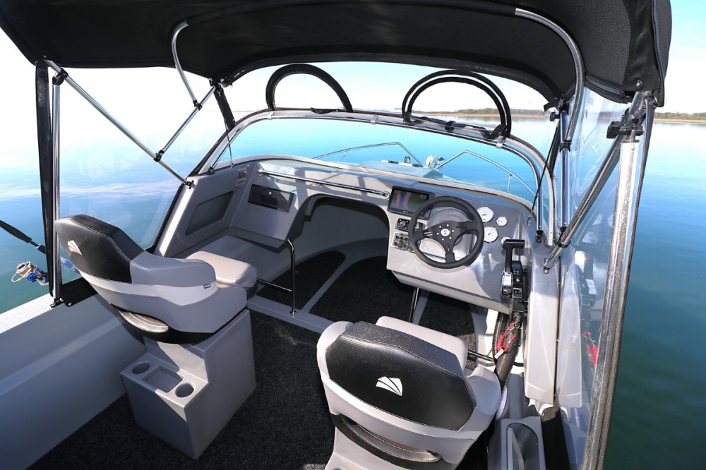 The dashboard, seating, and helm are all quite pleasing, and a pair of bolster-style upholstered seats on swivels are securely mounted on moulded plastic seat boxes with efficient storage. The dashboard is quite neat and has all the instruments and controls in easy reach. The layout allows for a Garmin Echomap 95+ GPS/Sounder 9“ multi-function unit that suited the package entirely; however, you would probably have difficulty if you wished to upgrade to a 12” screen.