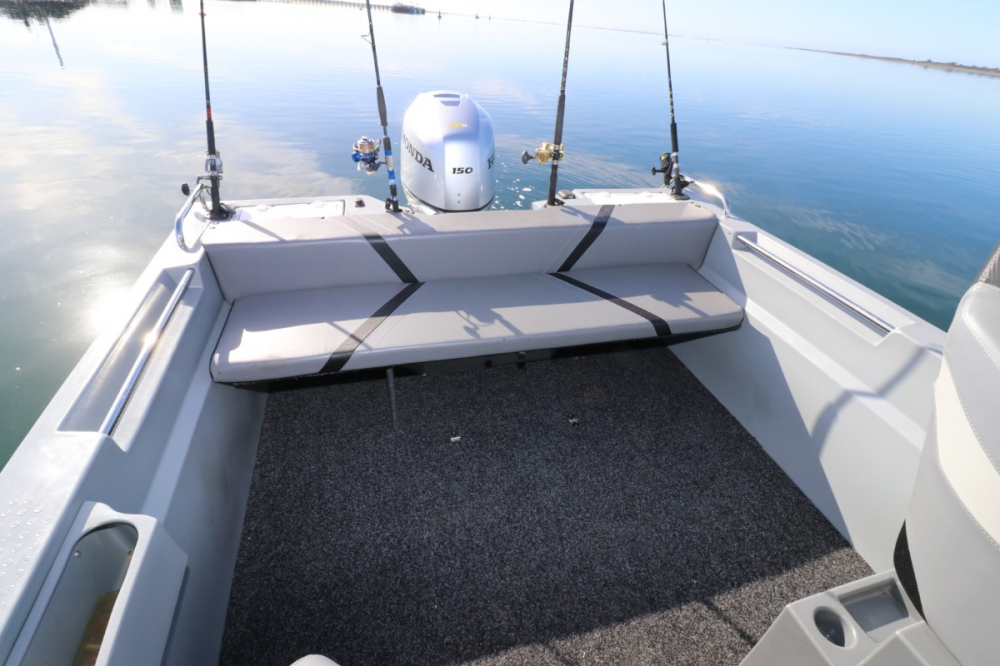 The internal combings are slab-sided without foot recesses due to the nature of the plastic construction, yet the deck/work area is really very large with nice, high sides for added safety. There is an assortment of moulded trays and knick-knack holders with recessed grab rails, a fully carpeted floor, an underfloor fish box, plastic rod holders and a traditional engine well with boarding platforms and bait hatches on either side. There is a full-width rear upholstered lounge, and while I reckon the seat section is just a little wide and would benefit from taking 50mm off to form toe holds when lowered, Stan reminded me that the lounge lizards will love the added dimension when frolicking in the sunshine.