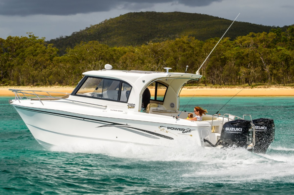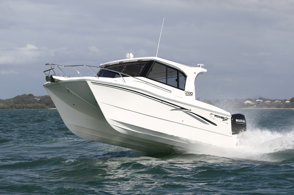 Being an ex-28’ Shark Cat owner, I was very keen to test the new Powercat 3100 Sedan Cruiser as a comparison. When I discovered it was fitted with a pair of the gutsy 300HP Suzuki outboards, I found it hard to contain my enthusiasm. I wasn’t disappointed – more like gob-smacked!