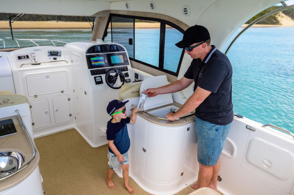 The layout is terrific. It has a luxuriously upholstered L-shaped lounge on either side of the large rear walk-through transom and drop-down ladder that’s ideal for some play time in and out of the water. There’s a drop-in table for an entertaining outdoor meal or afternoon drinks catered by a very neat kitchenette on the port side, complete with a stainless steel sink, Ecoheat slimline convection cooktop, a small pantry and Isotherm bar fridge freezer. The starboard side has a matching cabinet with an Isotherm Fridgemate chest fridge and more storage. It is all neat and simple, but very practical. There’s also a side cockpit door to simplify dockside loading, plus a practical and hard-wearing Rhino-coat flooring.