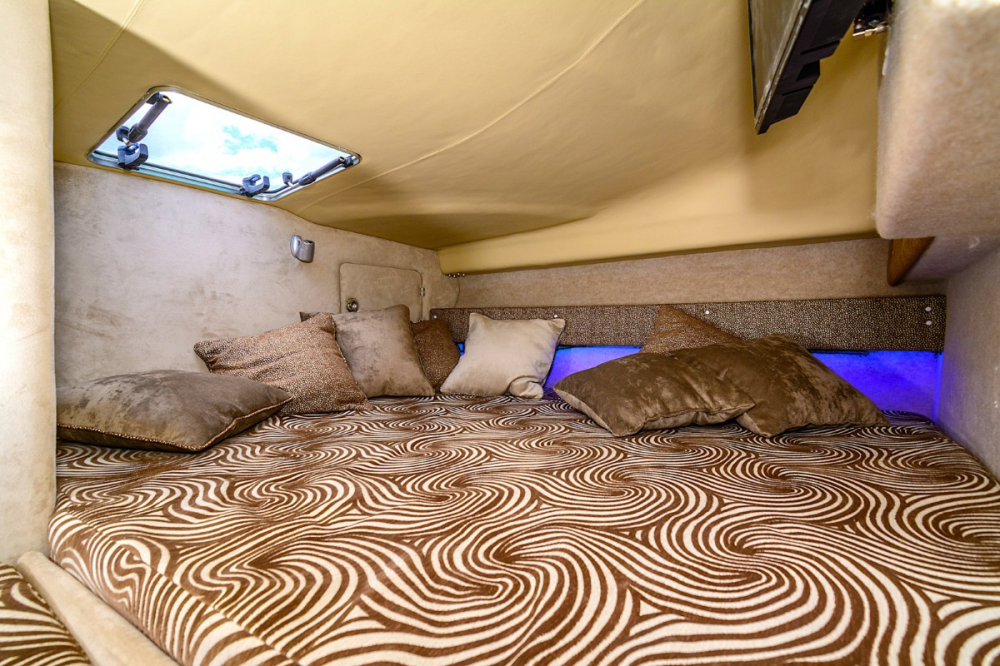The driver and passenger are treated to thickly upholstered bolster seats, although you will be tempted to naturally stand at speed. The helm unit also creates an enclosed head/bathroom module with a small vanity and a pull-out shower. It’s not huge, but certainly in easy proportion for us larger specimens. There’s even a microwave neatly moulded into the forward bulkhead, powered by a 1800-watt Pure Sine Wave Inverter and shore power.