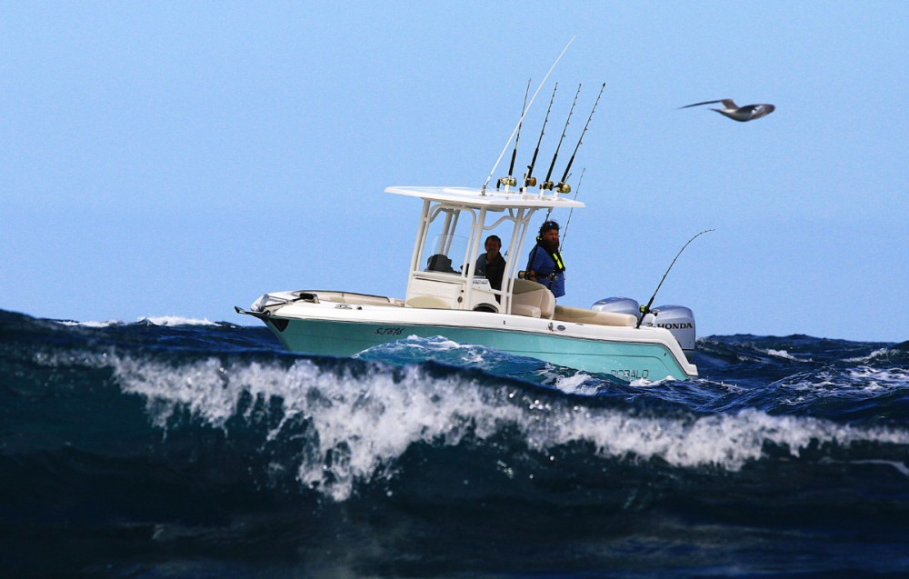 Robalo’s advanced Hydro Lift hull has been tried, tested, and proven. The R242 hull fills you with confidence with its 7.32 metre length overall, a considerable 2.67 metre beam (wide load rules apply), and a real wet, on-water weight of around 3100kg with a full belly of fuel and gear, but without passengers. The bulk translates into soft displacement, especially when teamed with a 22 22-degree variable deadrise design with a lovely entry to the composite fibreglass, foam-filled hull infused with Kevlar. She has a low weight distribution with wide reverse chines and full-length strakes, giving terrific lift and directional stability. When the throttles open up, the big Hondas sound out that high-performance V6 sweetness as they rocket the big hull over the 80km/h barrier. She has terrific grip and maneuverability, even in tight turns.