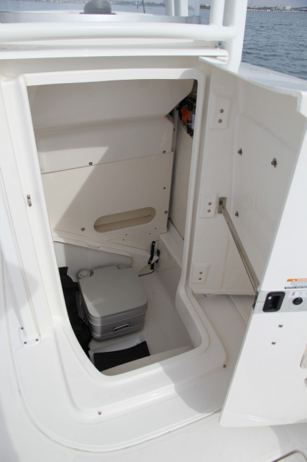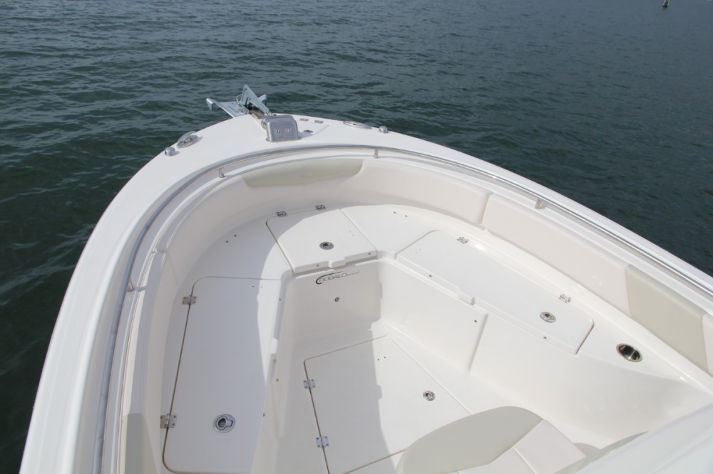 Getting a centre console past the purchase post can be challenging if there’s no enclosed head, so Robalo has come up with a ripper design. The entire front of the console hinges to the side, exposing a private toilet compartment. Large wet and dry tanks are under the floor, and big scuppers are to the rear for safety and easy cleaning. The bow converts from a lazy daybed to an elevated sportsfishing stage in seconds and has yet another bait tank and enclosed storage underneath.