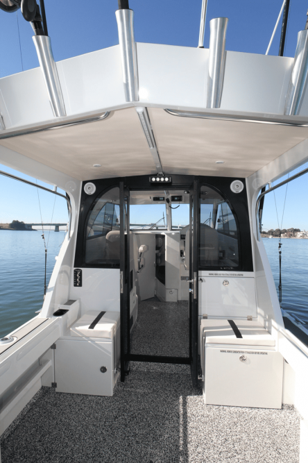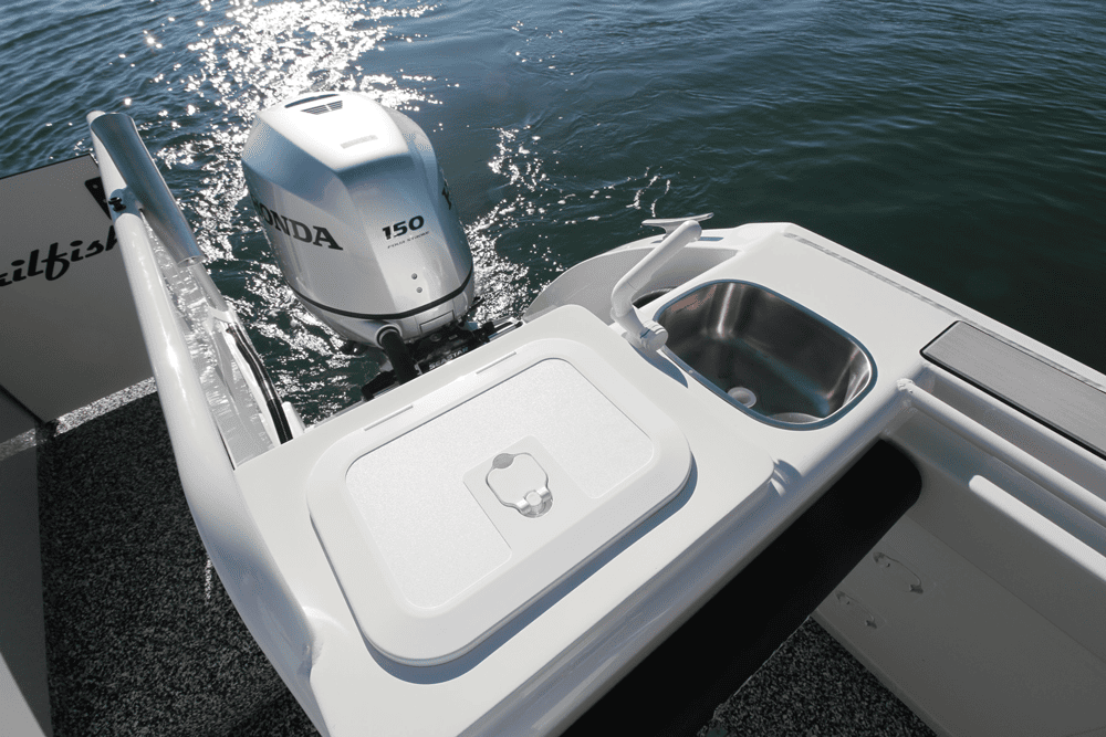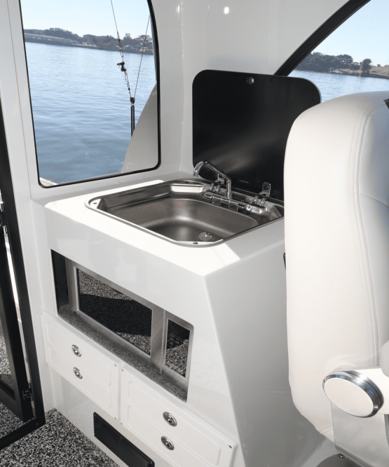 To ensure year-round boating comfort the package is also fitted with a 10,000BTU reverse-cycle air-conditioning and heating unit. Sailfishes are often complemented by the stone-like Rhino Coat flooring from the deck to the bathroom. It’s stylish yet tough and non-slip, making it ideal for this package.