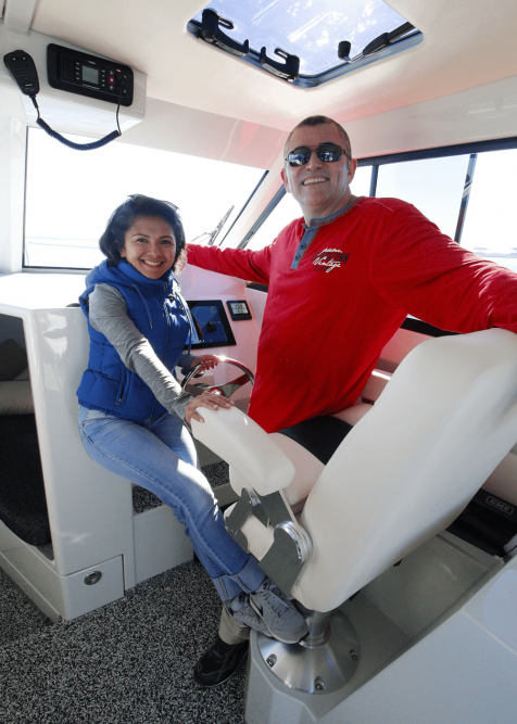I was thrilled to live the experience vicariously through the eyes of Ian Fairgrave and his gorgeous and effervescent wife, Yanti, who were taking an on- and off-water delivery of their glorious Sailfish 2800 Platinum at Webbe Marine in southern Sydney.