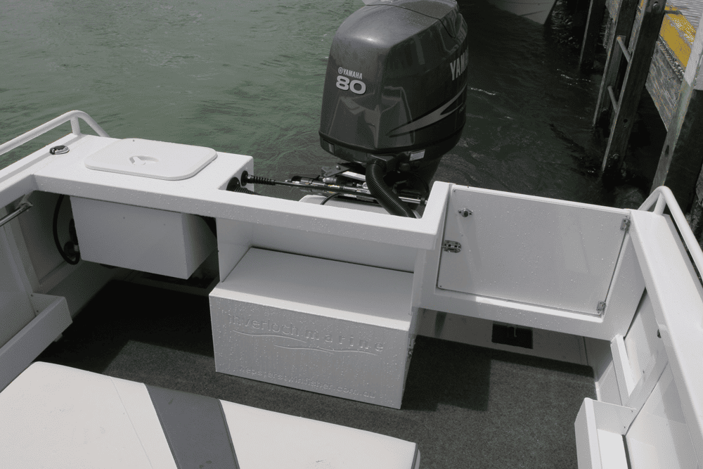 The transom is well designed and features a large live bait, also a very handy side door as standard. There is very little distance from the inner transom combings to the end of the engine making the boat very fishable. The battery is securely locked away in in its own centrally located and easily accessed compartment, and the deck drains to a small sump with a bilge pump. From the rear, a nice sized engine well and boarding platforms are on both sides. The port side allows good access through the door, and personally, I would mount a detachable burley pot to the starboard.