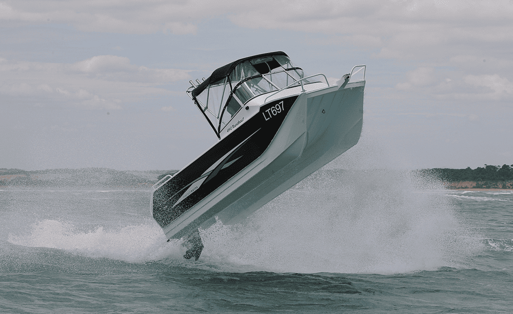 Our test boat was fitted with an 80 HP Yamaha F80B, 4-stroke EFI engine, which gave excellent performance and certainly seemed to match the package very well, especially if you are considering carrying the weight of a family with all their paraphernalia or three big fisho’s. The package is ideally suited as a dive boat as it will get large payloads up and out of the water, hydroplaning on the air cushion quickly and easily.