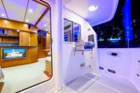 The staircase forward from the pilot house leads to an additional sub zero freezer for extended voyages and then onto the luxury accommodation deck, where you are greeted by two enormous well-appointed cabins with over two meters of headroom. The VIP cabin forward features a large double bed, an optional pull-out canvas bunk to port, a private office with workspace, and a pull-out chair. Forward of the VIP cabin, up one step, is the granite countertop ensuite with a large vanity, toilet, and separate shower stall.