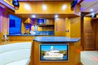 The master stateroom boasts a full queen-size island bed with ample space to walk around and abundant hanging space and drawers throughout. The private granite countertop ensuite is large and includes a vanity, toilet, and separate shower stall. On the master cabin’s aft bulkhead, off to starboard, is the watertight engine room access.