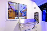 Forward of the main saloon, you have access to the pilot house via a generous staircase and handrail. The pilot house is the heartbeat of every voyage and accordingly has been refitted with a suite of new electronics, including two 16 inch Raymarine MFDs, AIS, doppler collision avoidance radar, autopilot, electronic compass, sounders, and night vision. The helm chair is an as new STIDD chair, offering exceptional comfort for long passages. Behind the helm is a generous seating area with Ultra Soft leather and another large teak table. Here you will also find the “watch cot” or single watch berth. To port features an extendable chart table, while the starboard side offers ample shelving for ship documents and a well-appointed wet storage area equipped with safety equipment. The pilot house provide access to both the port and starboard exterior of the vessel.