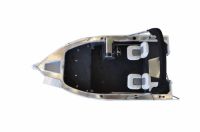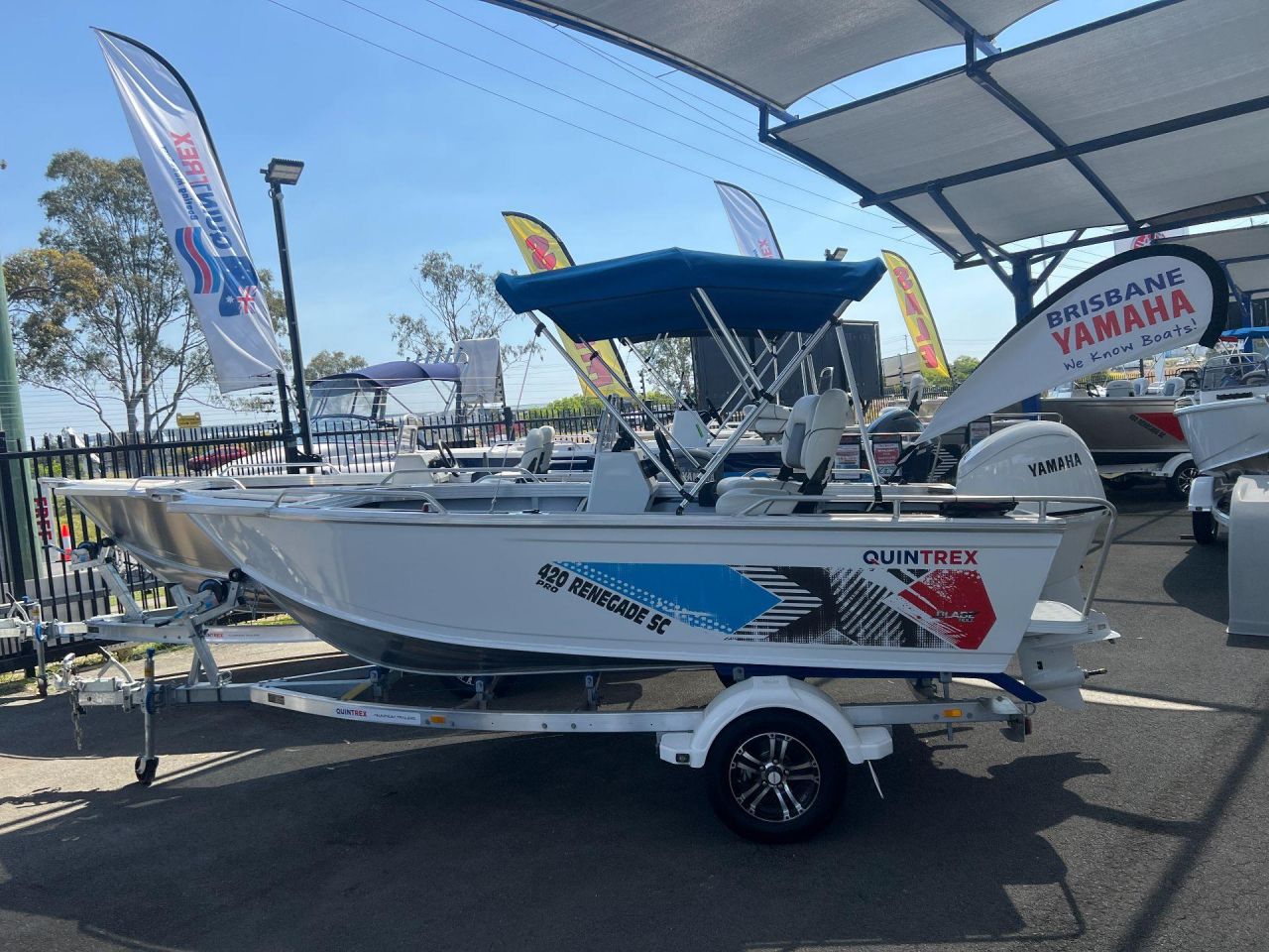 QUINTREX 420 RENEGADE PRO SC - PAINTED HULL, STRIPES/DECALS WITH FACTORY FITTED INCLUSIONS - Covers include Bimini and Envelope, casting platform, helm with side console and hydraulic steering, anchorwell, battery box, bow roller, cigarette lighter outlet, drink holder cups, Quintrex Ice Box 22 L, four rod holders, transom step and rail, alloy cleat on front deck, blade hull, centre console deck, rear casting platform and LBT, extruded side decks, side pockets, smooth topsides, two transducer brackets, side rails, Seatread kit, Quintrex seat covers, three seat positions with pedestal seats, special edition stripe, and helm hydraulic steering.