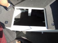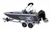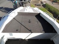 QUINTREX 530 FRONTIER SC - PAINTED IN 2-TONES WITH FACTORY FITTED INCLUSIONS - Carpeted and plywood casting platform, side console helm with hydraulic steering, Anchorwell, two cockpit lights, live bait tank, marine radio, maxi bracket, pole mount insert, rear ladder, four rod holders, scuppers, Apex hull, bow mount thruster plate, cleats on transom corners, raised side decks, side pockets, two transducer brackets, welded gunnels and top decks, painted hull, console grabrail, side rails, Seatread kit, four seat positions with Bass Sport seats and three pedestal seats, and hydraulic steering at the helm.