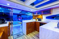 The layout most popular in the Riveria range with three tropical airconditioned staterooms including the full beam master stateroom with ensuite and owners retreat lounge, the Guest VIP Stateroom in the bow with its own ensuite, and the guest twin bed stateroom to starboard with its own ensuite shared day head, all staterooms and lounge equipped with flat screen smart TV’s. LED mood lighting throughout CALYPSO is soft and elegant.