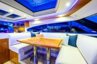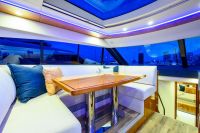 The saloon layout flows smoothly with helm to starboard, lounge and dinning conveniently located opposite for entertaining guests while underway, the electric sunroof allowing the day or night to enter the saloon and add a calm mood to the atmosphere.