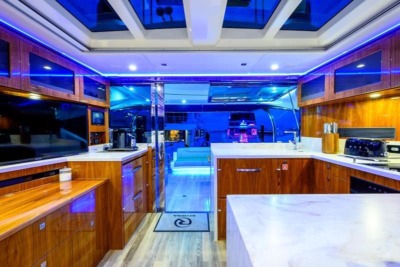 The interior luxuriously finished to the highest of Rivieras standard in glossy walnut timber, cream leather, vinyl flooring panels with soft carpet throughout the staterooms, the interior still with that new boat aroma.