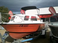 FEATURES INCLUDE: BIMINI, FRONT CLEARS, 2 X SWIVEL SEATS, FRONT CABIN WITH CUSHIONS,CABIN LIGHT, NAV LIGHTS, FIRE EXTINGUISHER, FUEL TANK, FENDERS, LIFE JACKETS ROD HOLDERS AND VIC REGO TRANSFERS