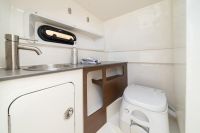 Enclosed head compartment w/ portable head, vanity, sink & opening portlight.