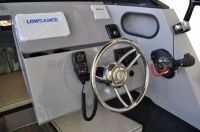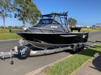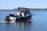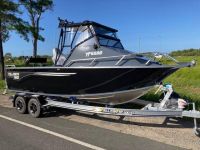 YELLOWFIN 6500 CABIN FOLDING HT - Painted in Pipeline Grey, carpeted, decals/stripes, standard factory inclusions such as anchorwell bow sprit, 260L fuel tank, hydraulic steering, live bait tank, sealed self-draining checker plate floor, stainless rod holders, side pockets, transom door, trim tabs, GT54 transducer.