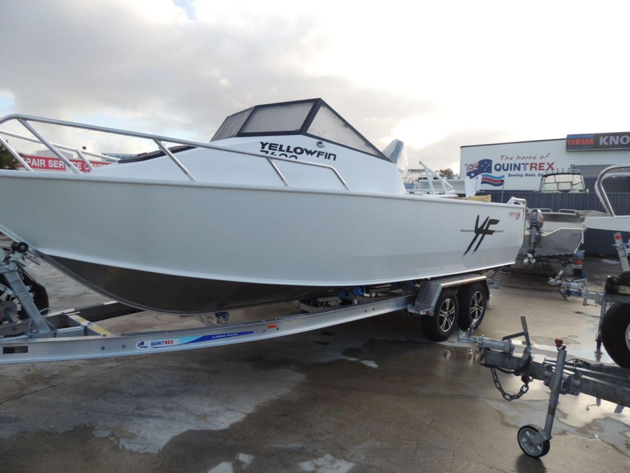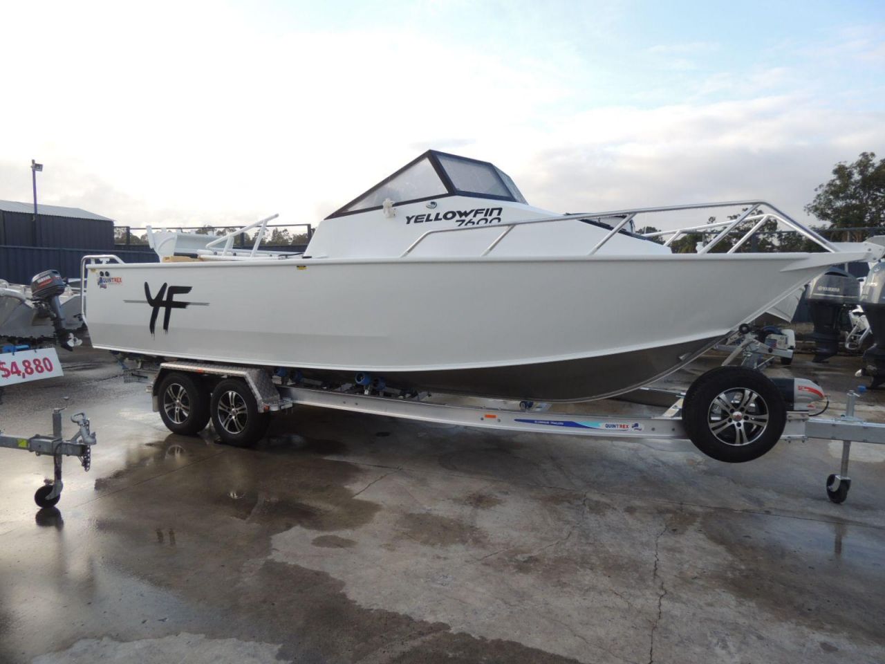 YELLOWFIN 7600 SOFT TOP CABIN - Fully painted with Factory Fitted inclusions: Accessory kit, carpet: cabin storage & lids, drink holder cups, live bait tank, maxi bracket, outrigger mounting plates, rod holders (6), scuppers, twin battery box & switch, X-bollard, self drain floor, self drain floor treadplate, anchorwell, cabin footrest, fully weld gunnels & side decks, S.S. bowroller, side pockets, transducer brackets x 2, trim tabs, welded gunnels and top decks, unpainted gunnels & transom, rails: bowrails, rails: cabin grabrail, rails: side, rails: transom, seats: helm box with hatch, seats: sea sport, hydraulic steering, transom door.