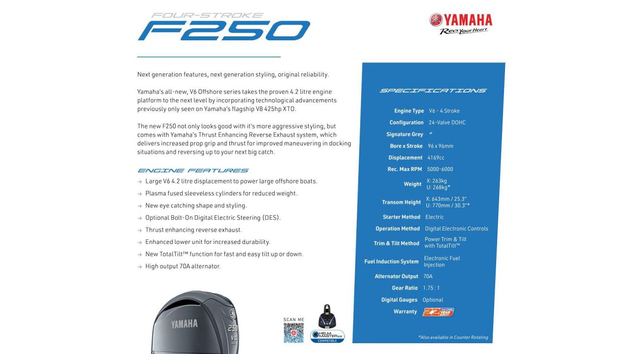 YAMAHA F250HP 4-STROKE - Forward Control with Side Concealed Control Box, Fly-By Wire, 2x Multifunctional Digital Gauges, Digital Electronic Control (DEC), Power Trim & Tilt with integrated limiter, Electric Start, SDS S/S Prop, Fuel Filter, Workshop fitted & Tested, Bolted on with PVC backing board, Loom & Control Cables, Dealer Delivery & Training